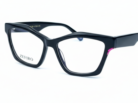 - Montatura in acetato laminato colore: Nero con dettaglio fucsia semitrasparente
